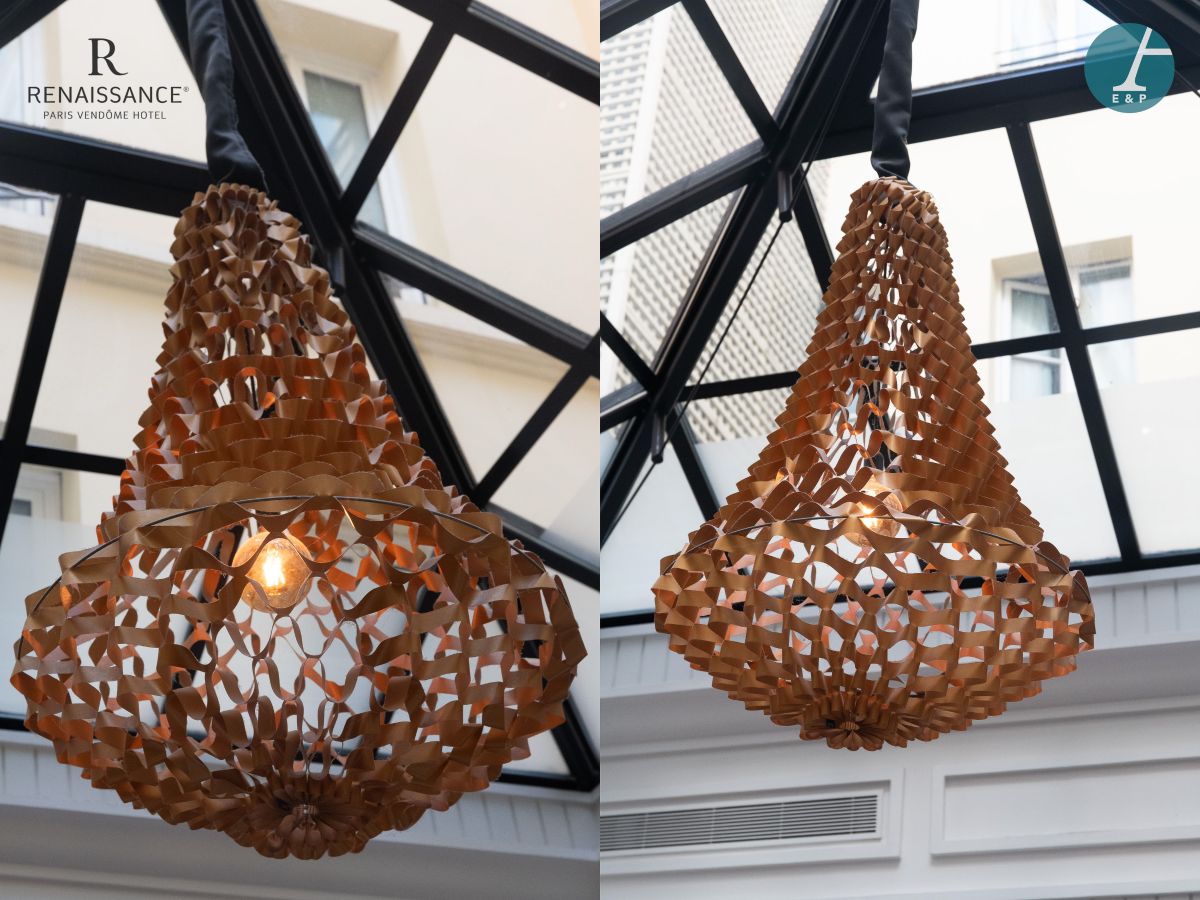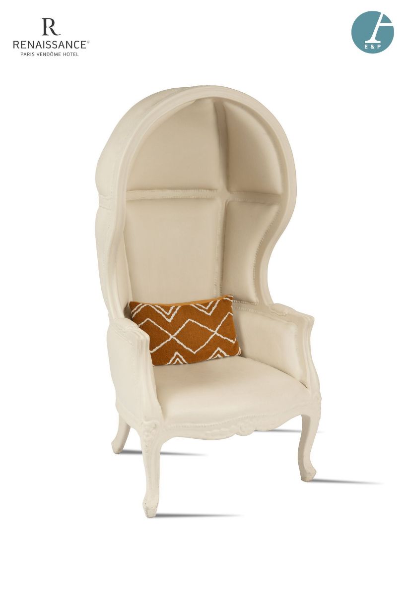 | Lot 102 JSPR - Fauteuil carrosse en bois mouluré et recouvert de résine blanche. Etat d'usage. H : 160cm - L : 77cm - P : 65cm Est : 200 - 400 € | Lot 17 Pièce encadrée, impression sur toile Profil de femme. Etat d'usage - Quelques accidents et manques. H : 250cm - L : 250cm Est : 100 - 200 € | Lot 15 JSPR - Modèle CROWN Paire de suspensions en lamellé de nylon ignifugé. Câble en tissu et câble suspension en acier. Etat d'usage Fonctionnement non garanti H: 130cm Est : 800 - 1600 € |