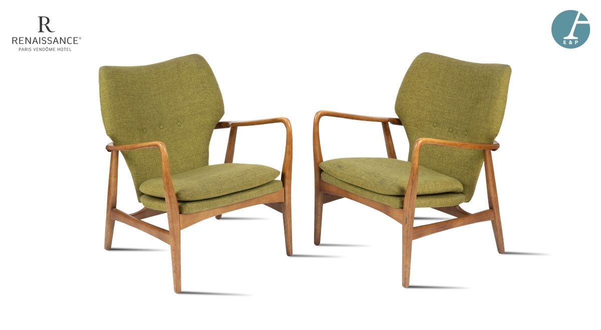 | Lot 42 POLS POTTEN Paire de fauteuils, piètement en bois naturel, garniture de tissu vert capitonné sur le dossier H : 80cm - L : 67cm - P : 70cm Etat d'usage | ![]() |